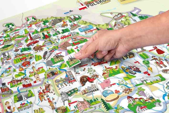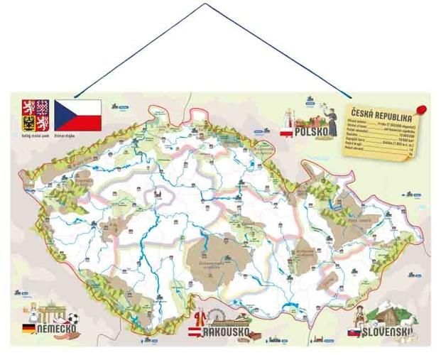 Naučné puzzle, školní pomůcka a společenská hra v jednom! Cílem je naučit vnímat dítě naši republiku jako stát, který je plný zajímavostí. Současně se zde dítě naučí rozčlenit naši republiku do jednotlivých okresů a určit jejich hlavní města. Na podkladové desce jsou rovněž zakresleny řeky a pohoří. Dítě přikládá dílky znázorňující jednotlivé okresy na podkladovou magnetickou plochu. Hranice jednotlivých okresů jsou vyznačeny tenkou červenou linkou, podle které dítě jednoduše určí, kam který dílek patří. Později už bezpečně ví a osvojí si znalost, kde se jednotlivé okresy nacházejí, s kterými sousedí atd… Díky obrázkům umístěným na každém dílku si děti ihned uvědomí, co je pro každý okres charakteristické, co se kde pěstuje, vyrábí, těží, kde jaká zvířata žijí, event., kde se jaká stavba, budova, hrad či zámek nachází. S kompletně poskládanou mapou si pak s rodiči nebo kamarády zahrají hru, která bystří smysly a trénuje postřeh. Design a kresby pocházejí od českých návrhářů. Věk: 3+. Rozměr: 77 × 47 × 0,5 cm.