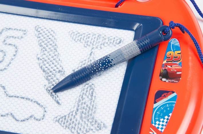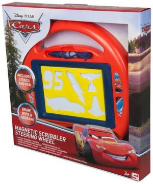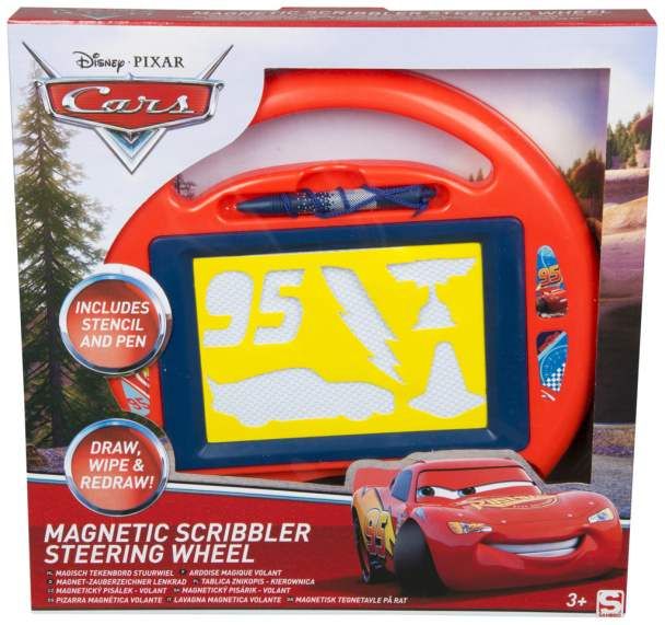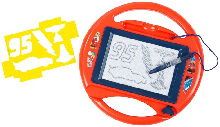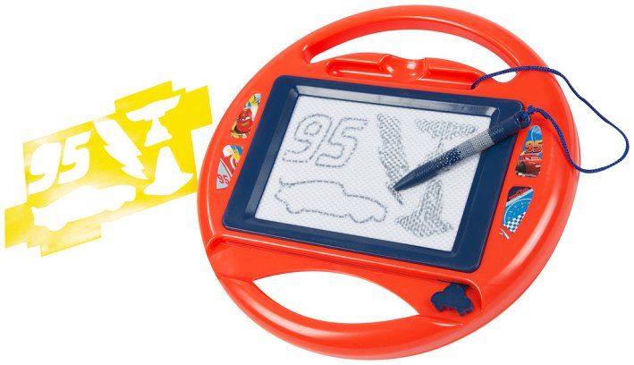 Magnetická psací tabulka Cars ve tvaru volantu. Tabulka obsahuje šablony a