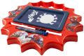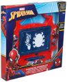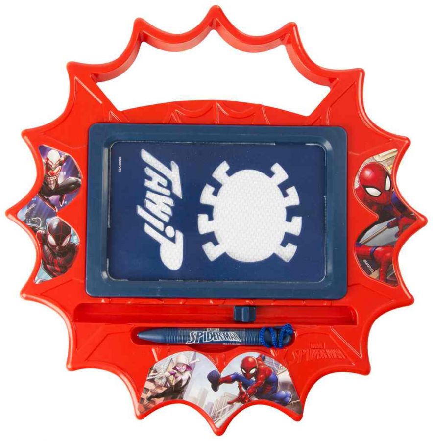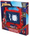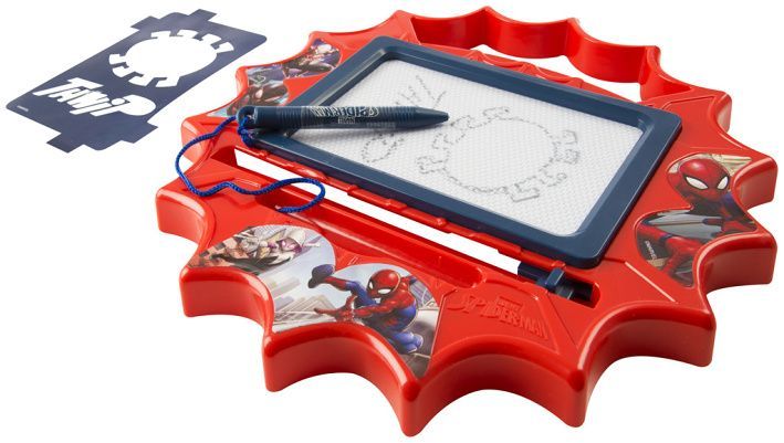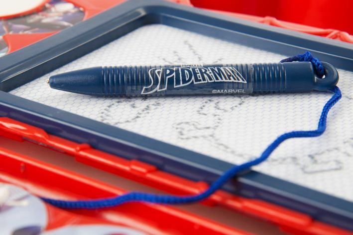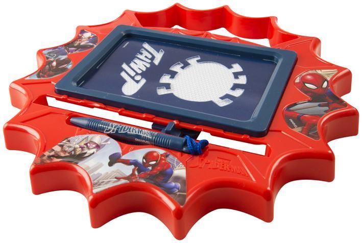 Magnetická psací tabulka Spiderman ve tvaru pavučiny. Tabulka obsahuje šablony a kreslící pero.