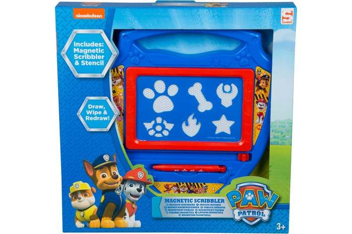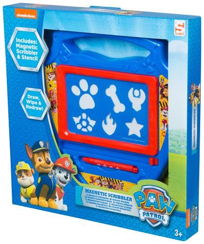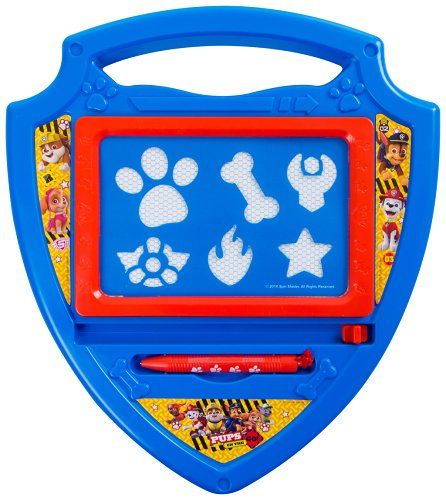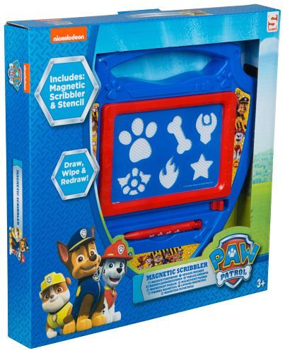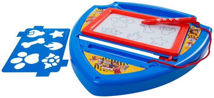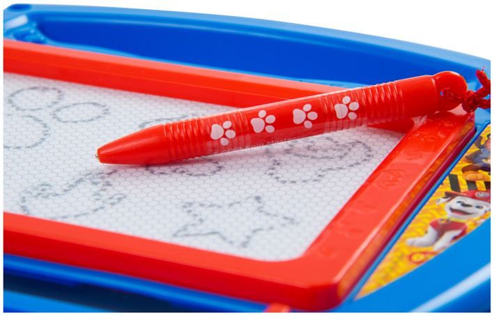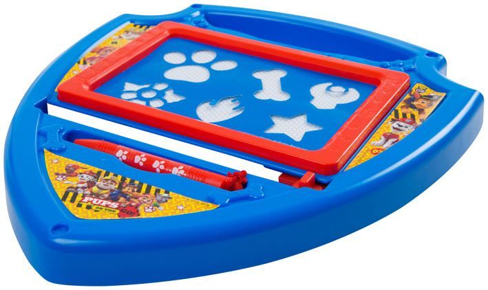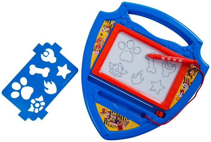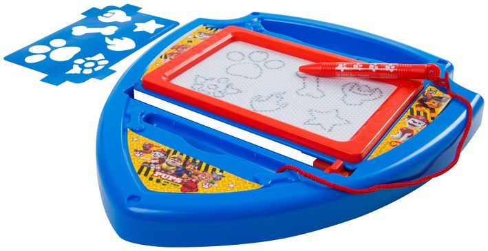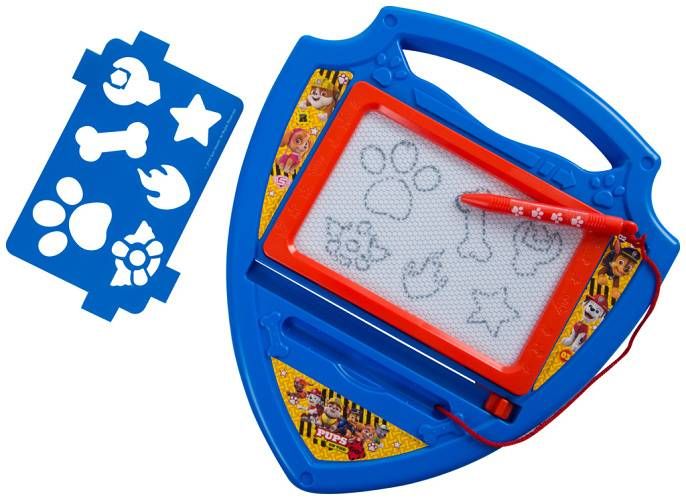 Magnetická psací tabulka Tlapková patrola ve tvaru policejního odznaku. Tabulka obsahuje šablony a kreslící pero.