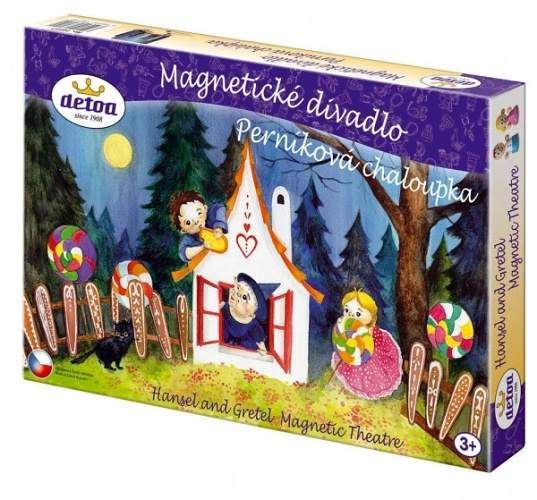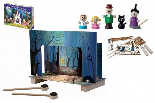 Krásná klasická pohádka v provedení magnetického divadélka. Můžeš si zahrát příběh o Perníkové chaloupce pomocí vodicích tyček a dřevěných figurek na oboustranných kulisách.