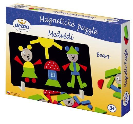 Dětské magnetické puzzle - skládačka. Sada obsahuje magnetickou tabulku a dřevěné magnetky různých tvarů se kterých se skládají medvídci, hříbek, domeček, sluníčko atd. dle fantazie. Veselé barevné magnetické tvary seskládají vaše děti do různých obrazců. Podporuje rozvoj tvořivosti, představivosti a fantazie. Poskládej si obrázky medvídků na magnetické tabuli dle vlastní fantazie.