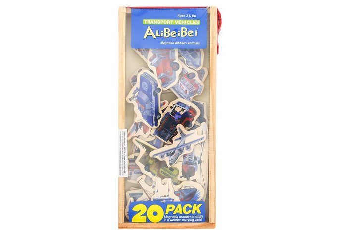 20 dřevěných magnetů s motivy dopravních prostředků jsou uloženy v dřevěné krabičce s plastovým víkem a v horní části s uchem na nošení.