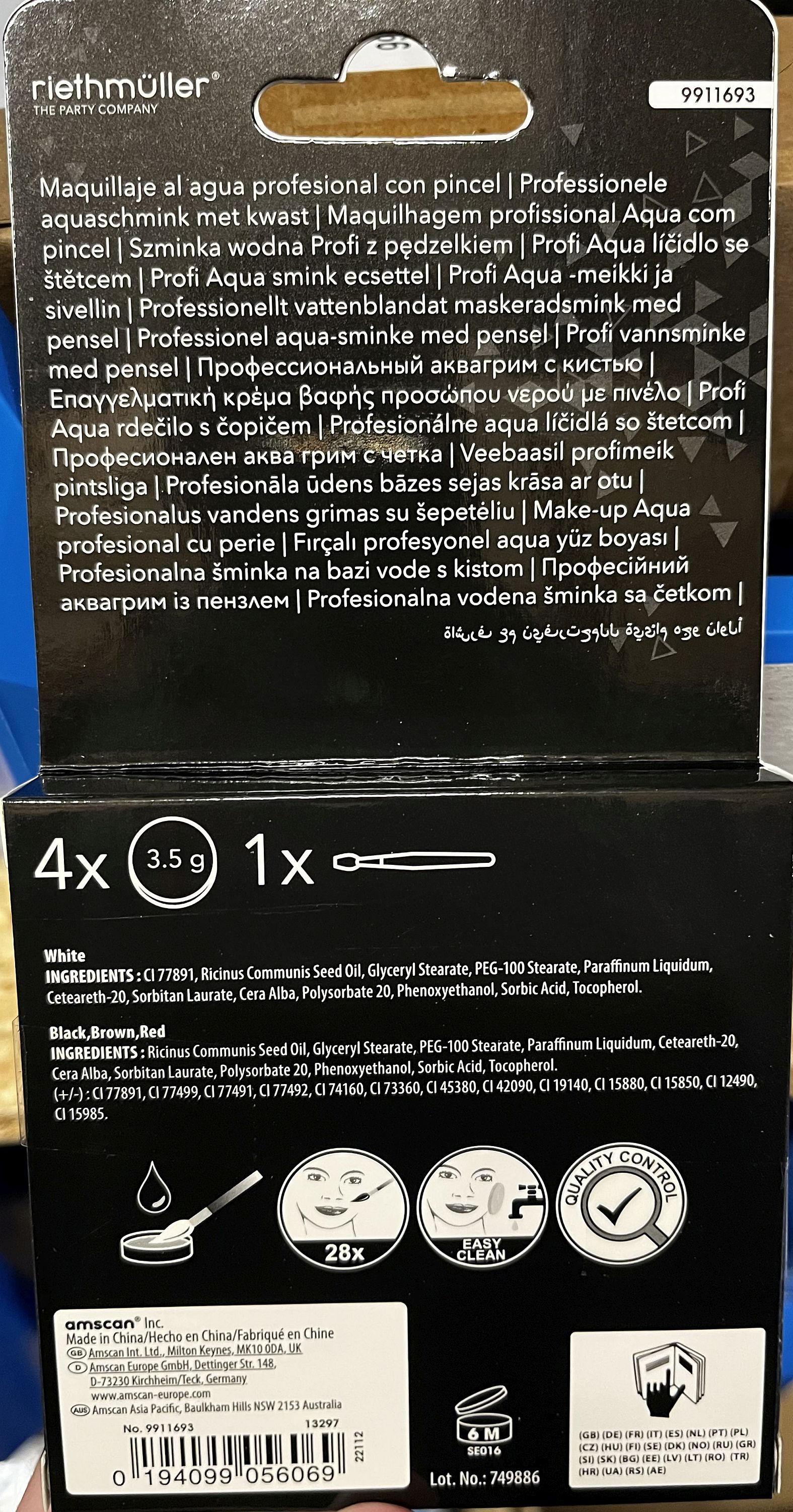 Ozdob si obličej a tělo barvičkami! Skvělá zábava pro tebe i tvé kamarády. Souprava barev na obličej obsahuje:1 štětec, 4 barvy x 3,5g (červená, hnědá, černá, bílá). Smíchejte barvy s vodou pro hladkou a snadnou aplikaci. Make-up je vhodný pro cca. 28 použití a lze jej snadno odstranit z pokožky vodou. Pozor - výrobek může způsobit alergickou reakci. Barvu nejprve vyzkoušejte na kousku kůže.