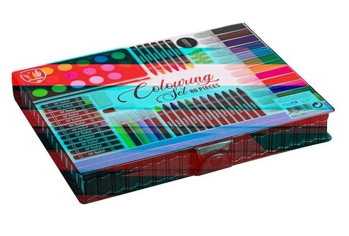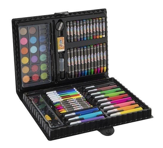 Malířská sada pro malé malíře obsahuje 80 ks potřeb pro malíře – vodovky, voskovky, fixy, ořezávátko,gumu, pravítko, štetce atd.