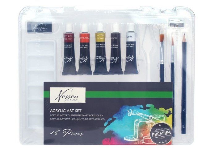 Malířská sada Start Acryl set – malířská sada obsahuje 10 základních barev, dva štětce, tužku, ořezávátko, nádobu na míchání barev.