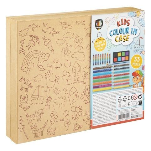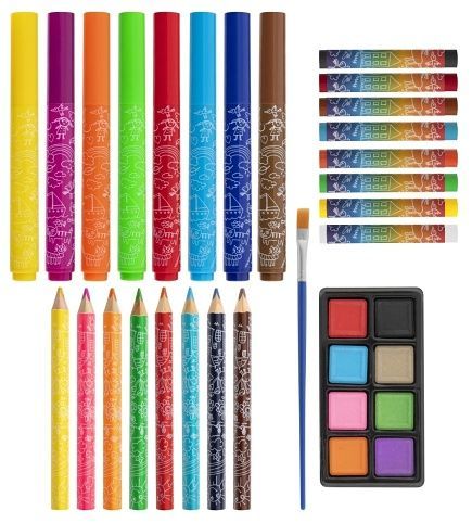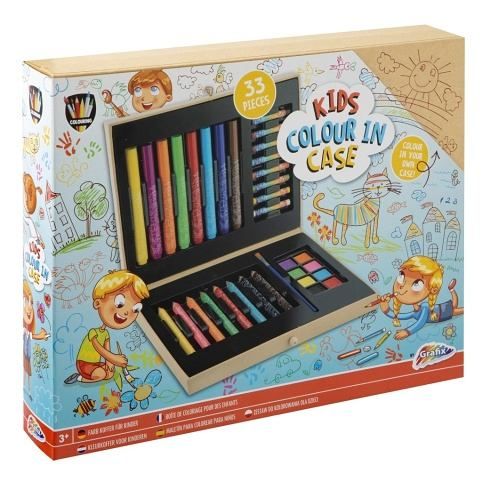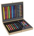 Malířský kufřík dětský 33 ks – obsahuje pastelky, fixy, štětec, vodovky a voskovky.