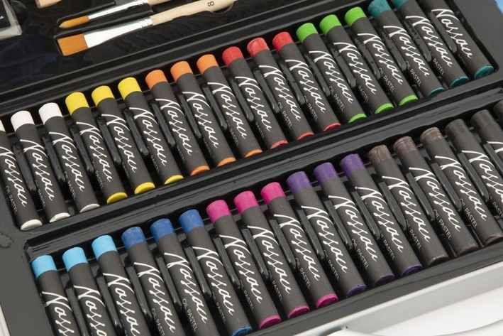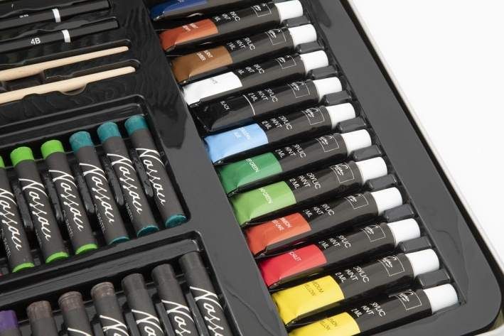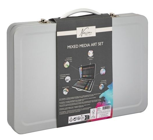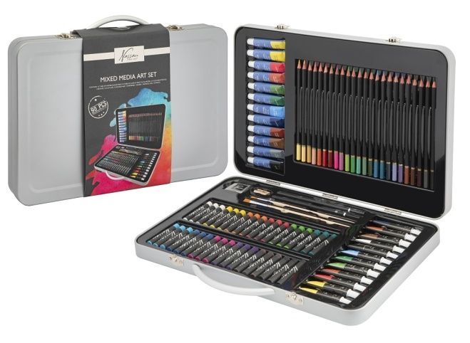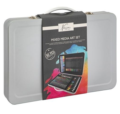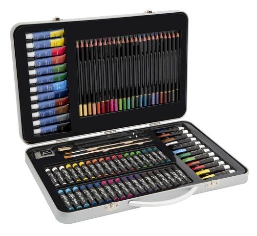 Malířský kufřík kovový Mixed Media Art – obsahuje 90 ks různých malířský potřeb – pastelky, tempery, voskovky, štětce, ořezávátka, gumy a další….