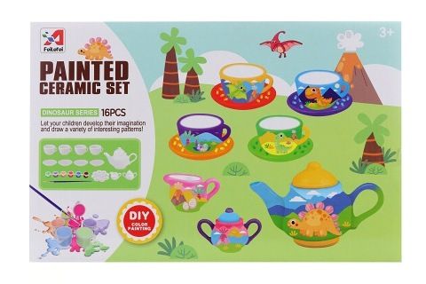 Keramická sada čajového servisu k malování. Balení obsahuje konvičku, mléčenku, cukřenku, 4 hrnečky, 4 podšálky, paletku,6 barviček a štěteček. Materiál doplňků je plast. Baleno v krabici. Rozměry balení cca 30x19,5x6,5 cm. Věk 3+