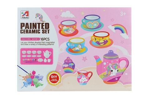 Keramický set čajového servisu k malování. Balení obsahuje 4 šálky, 4 podšálky, konvičku, cukřenku, mléčenku, štěteček, paletku a 6 barviček. Baleno v krabici. Rozměry balení cca 28x21x5,5 cm. Věk 3+