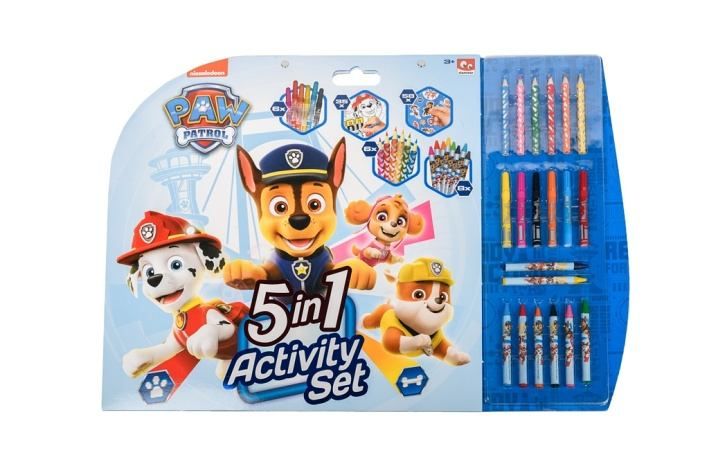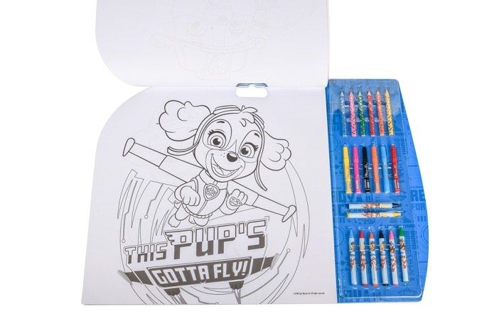 Malovací sada 5v1 Tlapková obsahuje – 8 ks voskovek, 6 ks fixů, 6 ks pastelek, aršík s 84 samolepkami Tlapková patrola, 15 šablon a čisté papíry.