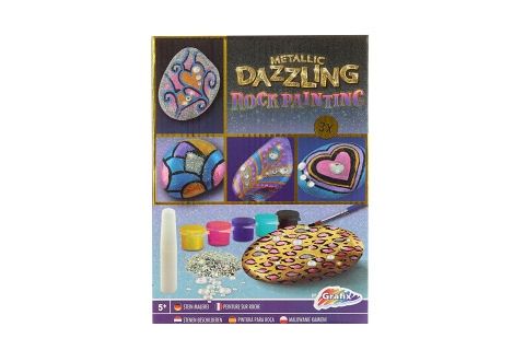 Sada malování kamínků obsahuje 3 kamínky různých velikostí- cca 4,5 a 8 cm, paletku s 5i barvami, štětec, třptky a malé kamínky.. Rozměry balení 15,5x21x4 cm. Věk 5+