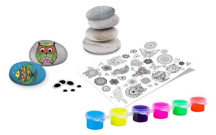 Malování kamínků Neon – namaluj si své kamínky neonovými barvami. Balení obsahuje 6× neon barev, šablony, 1× štětec, 1× dřevěné škrabátko, třpytivé nalepovací kamínky a 4 kamínky.