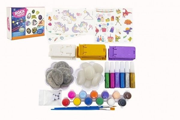 Zábavné zdobení kamenů, které zabaví najen děti, ale i dospělé. Pokud kamínky z balení dojdou v přírodě jich na vás čeká dost. Vynikající hračka pro rozvoj manuální zručnosti. Vše potřebné k výrobě najdete uvnitř balení. Balení obsahuje: 12 kamenů (z toho 6 svítících), 6x glitrové lepidlo, 12x barvy v uzavíratelných kelímkách, samolepky, palety na míchání barev, štětce, pohyblivé oči, stojánky pro malování kamenů.