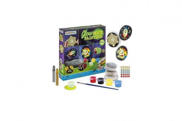 Malování na kameny/oblázky svítící ve tmě s barvami se štětci s doplňky v krabici 26x25x5c