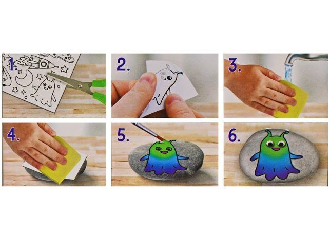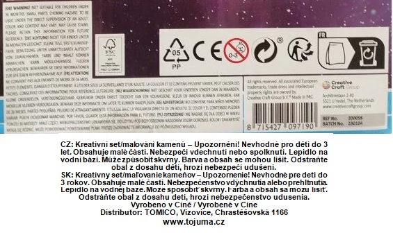 Malování na kamínky galaxy – namaluj si své kamínky galaxy barvami a ozdob samolepkami. Balení obsahuje 6 barev, štětec, 6 očíček, 6 hvěždiček, aršík se samolepkami 3 kamínky.