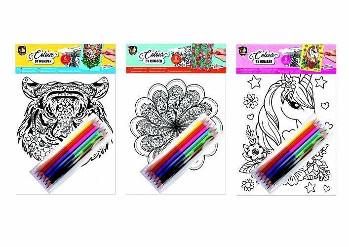 Malování podle čísel – velikost A4. Sada obsahuje 6 různých obrázků ve třech assortech,. Součástí balení jsou i duo pastelky – celkem 12 různých barev.