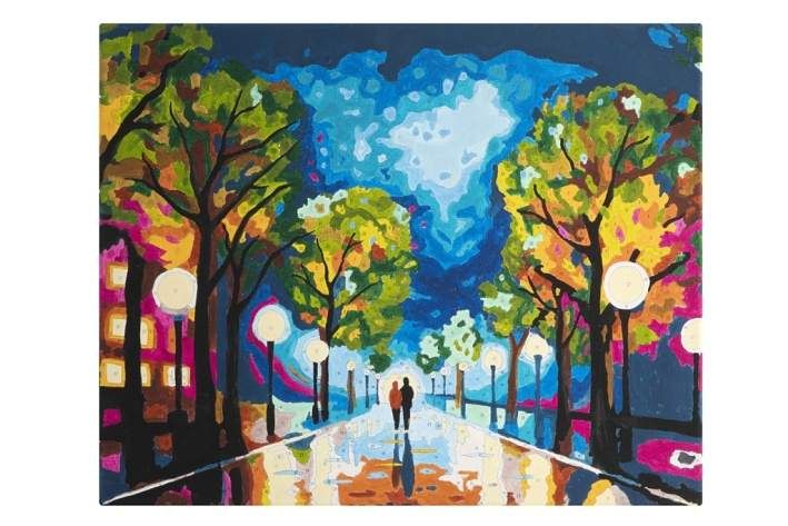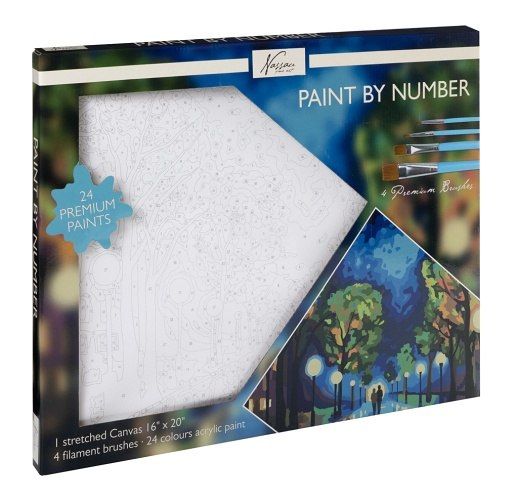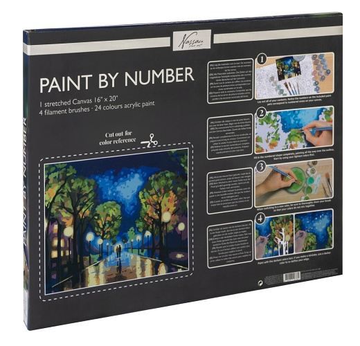 Malování podle čísel – balení obsahuje plátno s obrázkem 16×20 cm, 4 ks prémiových štětců, 24 ks akrylových barev.