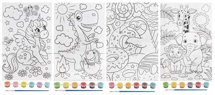 Malování podle čísel – čtyři dětské motivy. Balení obsahuje 6 barev a štětec. Velikost obrázku je 29,7×19,5 cm.