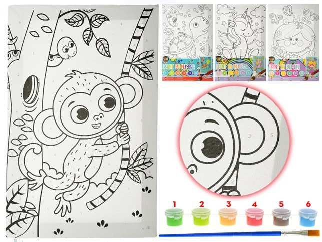Malování podle čísel – 4 různé druhy – želva, holčička, jednorožec a opička. Balení obsahuje obrázek, štětec a vodové barvy.