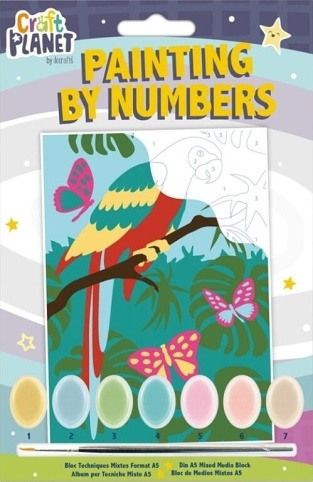 Plátno A5 210 x 148 mm, 7 x akrylové barvy a štětec. Akrylová barva poskytuje dobré krytí na desce, která je potištěna jednoduchým designem, který je číslován, aby děti vedly, kde použít vhodnou barvu. Tento projekt je navržen tak, aby umožnil začínajícímu umělci vytvořit umělecké dílo, na které může být hrdý.