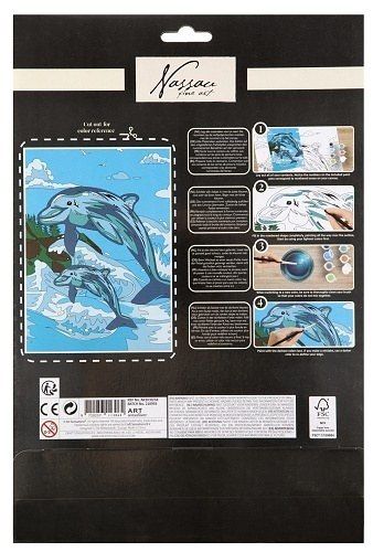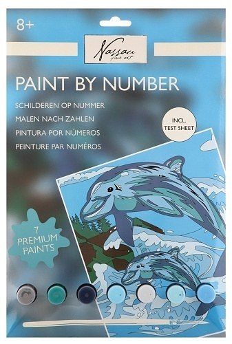 Malování podle čísel delfín – obsahuje zkušební šablonu, obrázek, štětec a 7 prémiových barev.