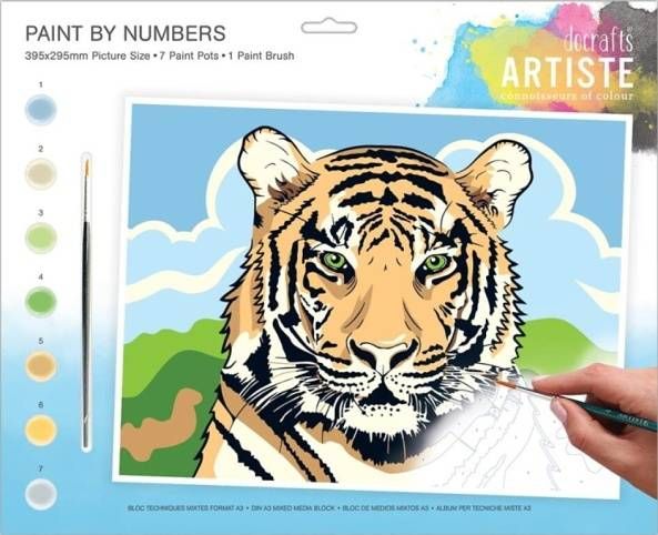 Plátno 395 x 295 mm, 7 x akrylové barvy a štětec. Akrylová barva poskytuje dobré krytí na desce, která je potištěna jednoduchým designem, který je číslován, aby děti vedly, kde použít vhodnou barvu. Tento projekt je navržen tak, aby umožnil začínajícímu umělci vytvořit umělecké dílo, na které může být hrdý.