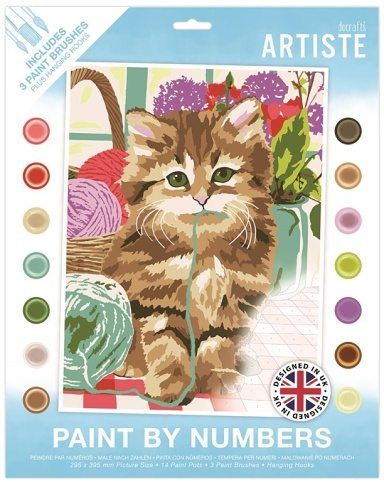 Plátno 395 x 295 mm, 14 x akrylové barvy a štětec. Akrylová barva poskytuje dobré krytí na desce, která je potištěna jednoduchým designem, který je číslován, aby děti vedly, kde použít vhodnou barvu. Tento projekt je navržen tak, aby umožnil začínajícímu umělci vytvořit umělecké dílo, na které může být hrdý.