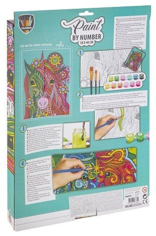 Malování podle čísel – balení obsahuje plátno s obrázkem 30×40 cm, 3 ks prémiových štětců, 12 akrylových barev.