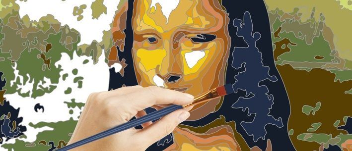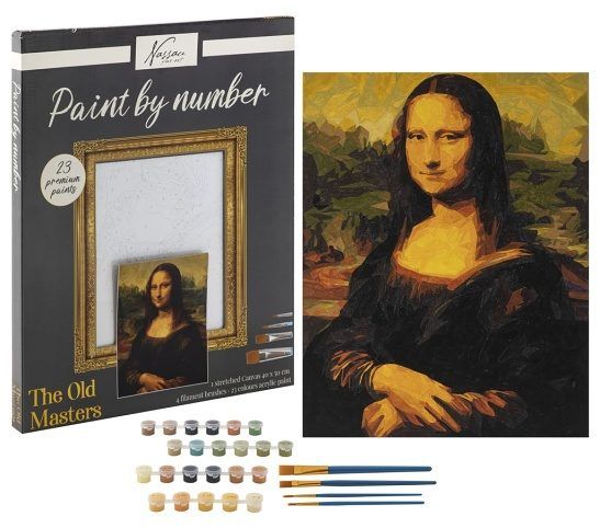 Malování podle čísel na plátno Mona Lisa 40×50 cm na plátně. Balení obsahuje obrázek vytištěný na bavlněném plátně, 23 prémiových barev a 4 ks štětců.