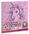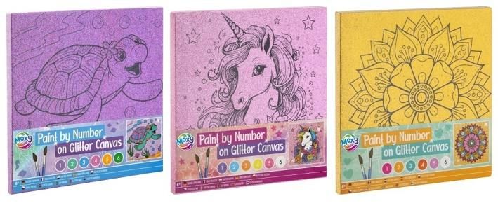 Malování podle čísel na třpytivé plátno – součástí balení třpytivé plátno s předtištěným obrázkem , 6 vodových barev a dva štětce. Tři různé druhy obrázků – mandala, jednorožec a želva,.