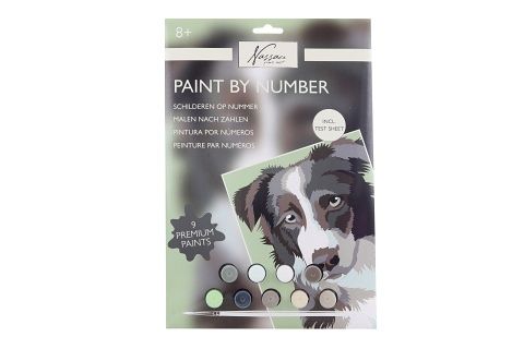 Malování podle čísel s motivem psa. Balení obsahuje 1 obraz z tvrdého kartonu o velikosti A4, 9 barviček a štětec. Věk 8+