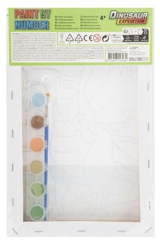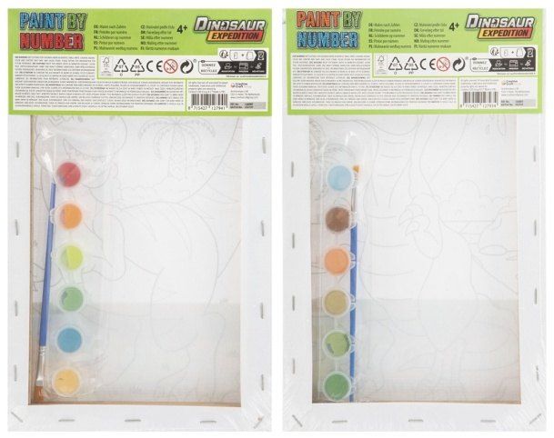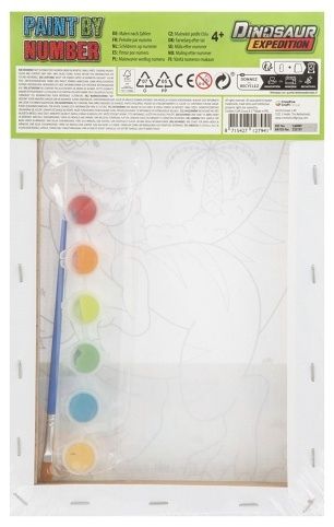 Malování podle čísel + vodovky Dinosaurus – balení obsahuje obrázek dinosaura s čísly + 6 ks vodových barev a štětec. Dva různé druhy.