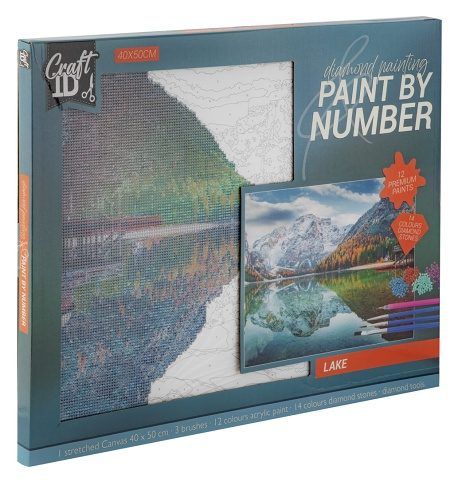 Malování pomocí kamínků Diamond/podle čísel Jezero 40×50 cm. Tento obrázek kombinuje dvě techniky pomocí kamínků a malování podle čísel. Součástí balení vodové barvy, štetec, aplikátor, kamínky a obrázek.