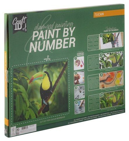 Malování pomocí kamínků Diamond/podle čísel Tukan 40×50 cm. Tento obrázek kombinuje dvě techniky pomocí kamínků a malování podle čísel. Součástí balení vodové barvy, štetec, aplikátor, kamínky a obrázek.