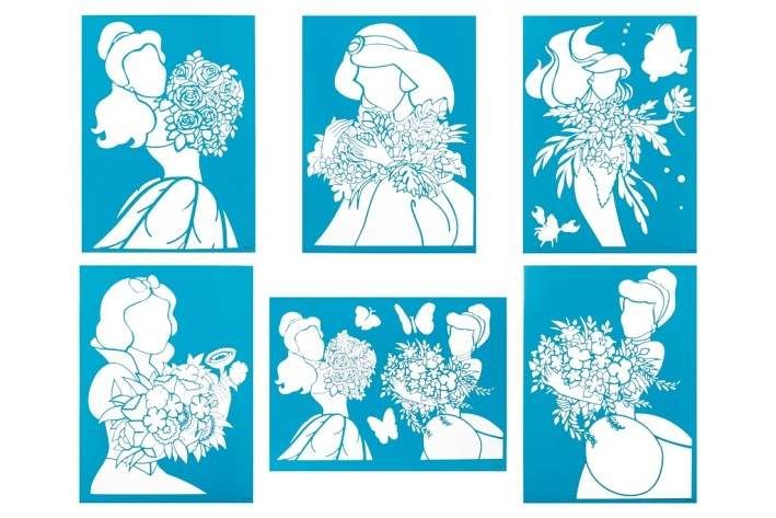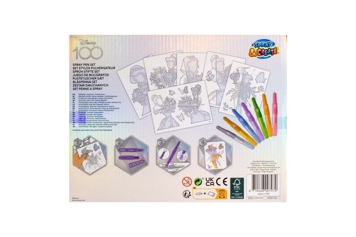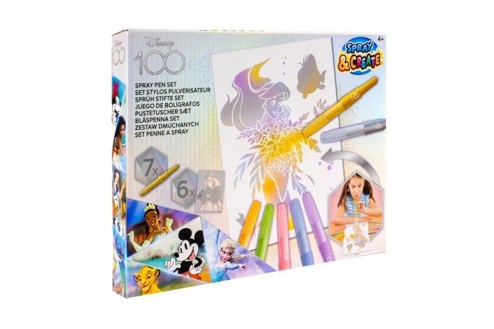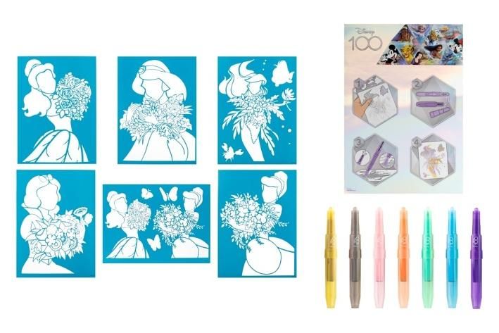Malování s foukacími fixami Disney100 Princezny – obsahuje 7 ks foukacích fixů a 6 šablon s obrázky.