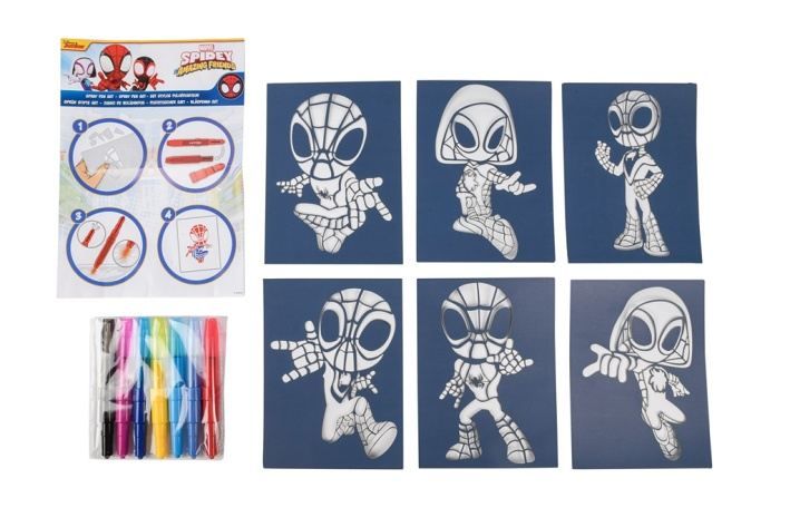 Malování s foukacími fixami Spidy – obsahuje 7 ks foukacích fixů a 6 šablon s obrázky.