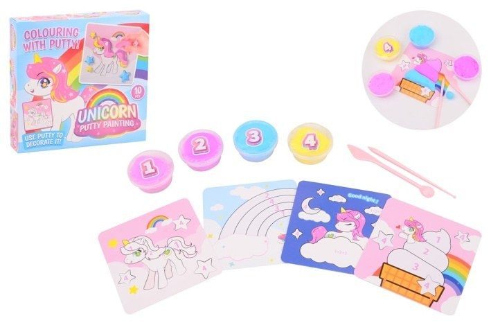 Malování s modelínou Jednorožec – 4 obrázky si můžete odekorovat podle čísel přiloženou modelínou. Balení obsahuje 4 obrázky, 4 barvy modelíny a dvě tvořítka.