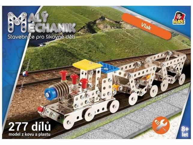 Malý mechanik - vlaková souprava. Dětská stavebnice Malý mechanik obsahuje kovové díly a plastové doplňky, spojuje se pomocí šroubků a matiček, který ch má celkem 277 dílků. Stavebnice jsou ideální volbou pro všechny děti, rozvíjí logické myšlení, jemnou motoriku, soustředěnost a učí trpělivosti a přitom jsou skvělou zábavou. Český box v grafickém designu řady Malý mechanik. Rozměr: 32 x 2 x 7,5 cmDoporučený věk: 6 +