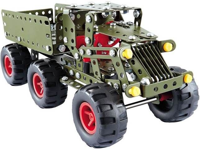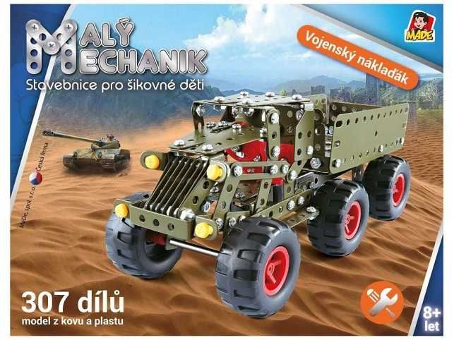 Malý mechanik - vojenské auto. Dětská stavebnice Malý mechanik obsahuje kovové díly a plastové doplňky, spojuje se pomocí šroubků a matiček. 307 dílků. Stavebnice jsou ideální volbou pro všechny děti, rozvíjí logické myšlení, jemnou motoriku, soustředěnost a učí trpělivosti a přitom jsou skvělou zábavou. Český box v grafickém designu řady Malý mechanik. Rozměr: 25,5 x 10,5, x 11 cmDoporučený věk: 6 +