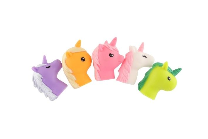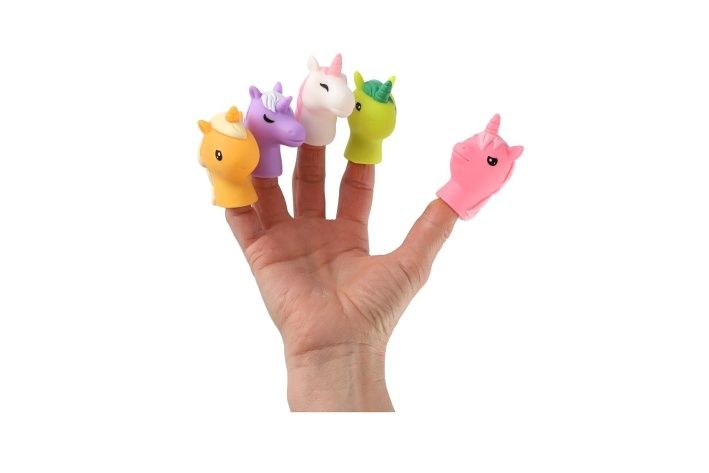 Děti si s prstovými jednorožci mohou zahrát maňáskové divadlo. Sada obsahuje 5 ks gumových jednorožců.