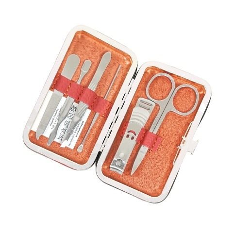Cestovní manikúrní set 6 ks v korálovém provedení. Stříbrná sada obsahuje nůžky, kleštičky na nehty, zkosenou pinzetu, pilník, manikúrní tyčinku a zatlačovač kůžičky. Ideální velikost do kabelky či na cesty.