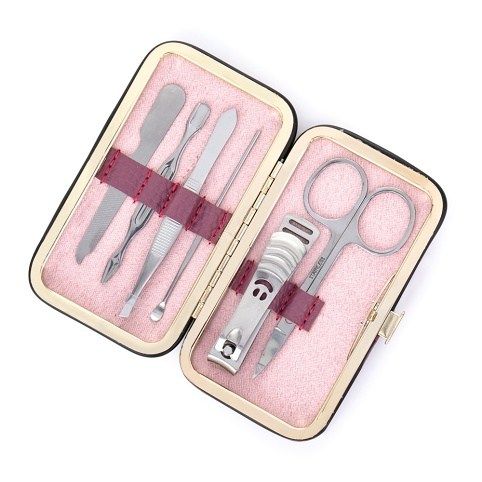 Cestovní manikúrní set 6 ks v růžovém provedení. Stříbrná sada obsahuje nůžky, kleštičky na nehty, zkosenou pinzetu, pilník, manikúrní tyčinku a zatlačovač kůžičky. Ideální velikost do kabelky či na cesty.
