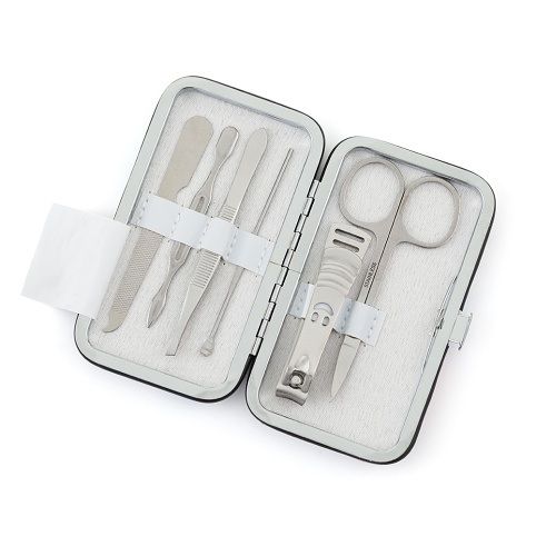 Cestovní manikúrní set 6 ks v barevném provedení. Stříbrná sada obsahuje nůžky, kleštičky na nehty, zkosenou pinzetu, pilník, manikúrní tyčinku a zatlačovač kůžičky. Ideální velikost do kabelky či na cesty.
