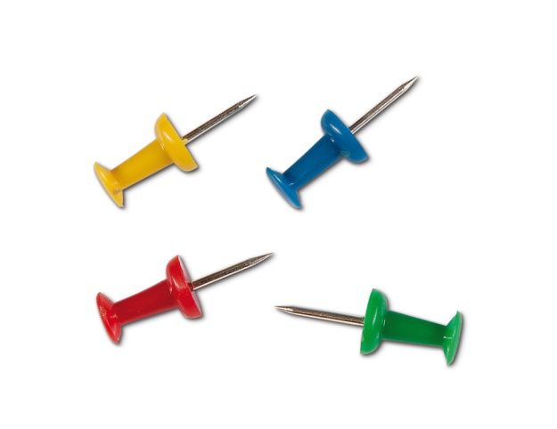 100ks mapových špendlíků ve tvaru věžičky v praktické plastové krabičce. Délka špendlíku s hlavičkou je 2,3cm.