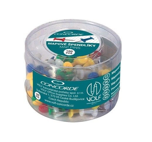 Mapové špendlíky CONCORDE, dóza 100ks, barevné