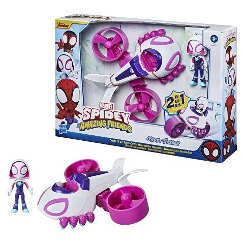 S tímto konvertovacím vozidlem ze seriálu Spider-Man a jeho úžasní přátelé na vás čeká dvojitá dávka dobrodružství! Každé vozidlo a figurka v této sadě funguje na bázi 2 v 1. Stejně jako v seriálu na Disney Junior se tato vozidla dokážou v mžiku proměnit na něco úplně jiného, a našim hrdinům tak poslouží při jejich nekonečných dobrodružstvích! V sadě najdete figurku Spider Gwen a její helikoptéru, která se může proměnit na motorku, Spider-Mana a jeho závodní auto, které se může proměnit na šplhající stroj, a Milese Moralese a jeho terénní tříkolku, která se může proměnit v závodní člun. Zahrnuje figurku a vozidlo.