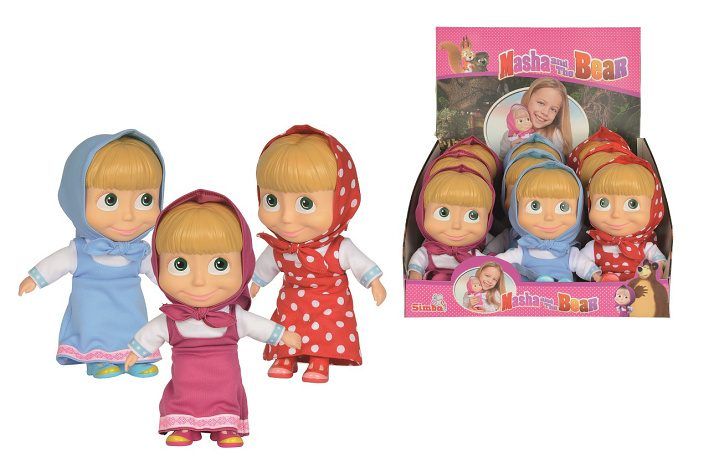 Panenka Máša z oblíbeného dětského seriálu "Máša a medvěd" s měkkým tělíčkem. 3 druhy. Výška panenky 23 cm. Displej 9 ks.
