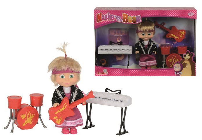 Panenka Máša z dětského seriálu "Máša a medvěd". Tentokrát jako hudebnice s kytarou, bubny a klávesy. Výška panenky 12 cm.
