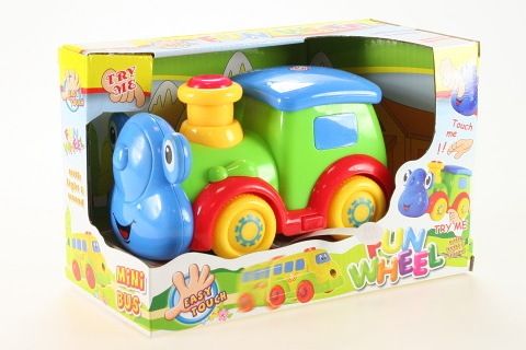 Plastová mašinka se světlem a zvukem. Velikost cca 16cm. Provoz na 3 knoflíkové baterie typu AG 13 (jsou součástí balení). Věk 1+